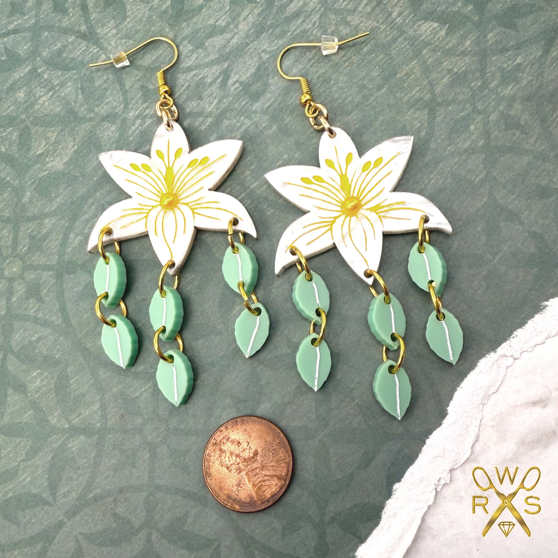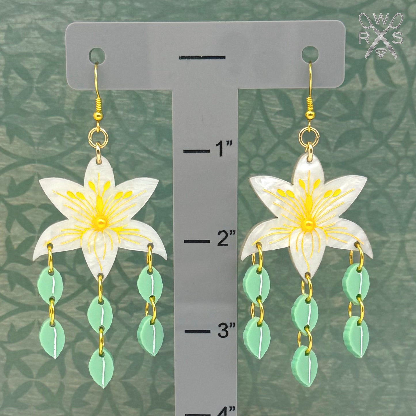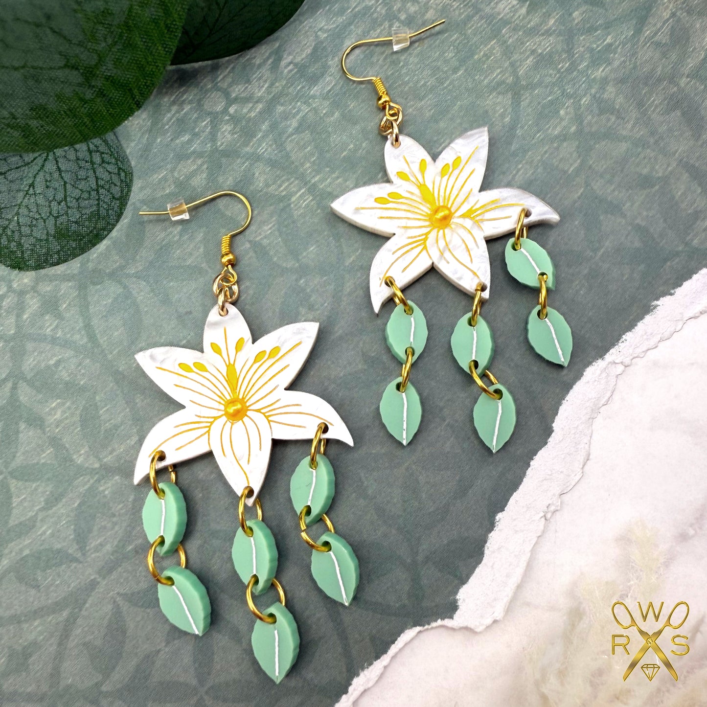 Add an enchanting floral beauty to any outfit with our Enchanted Lily Dangles from the GothicBloom Collection. Featuring a beautiful white lily detailed in gold with a gold pearl bead, followed by light green leaves dangling at the bottom, these earrings are pretty, fun, vibrant, and eye-catching. Perfect for those who want to stand out, add a touch of class and make a statement with their unique sense of style.