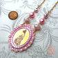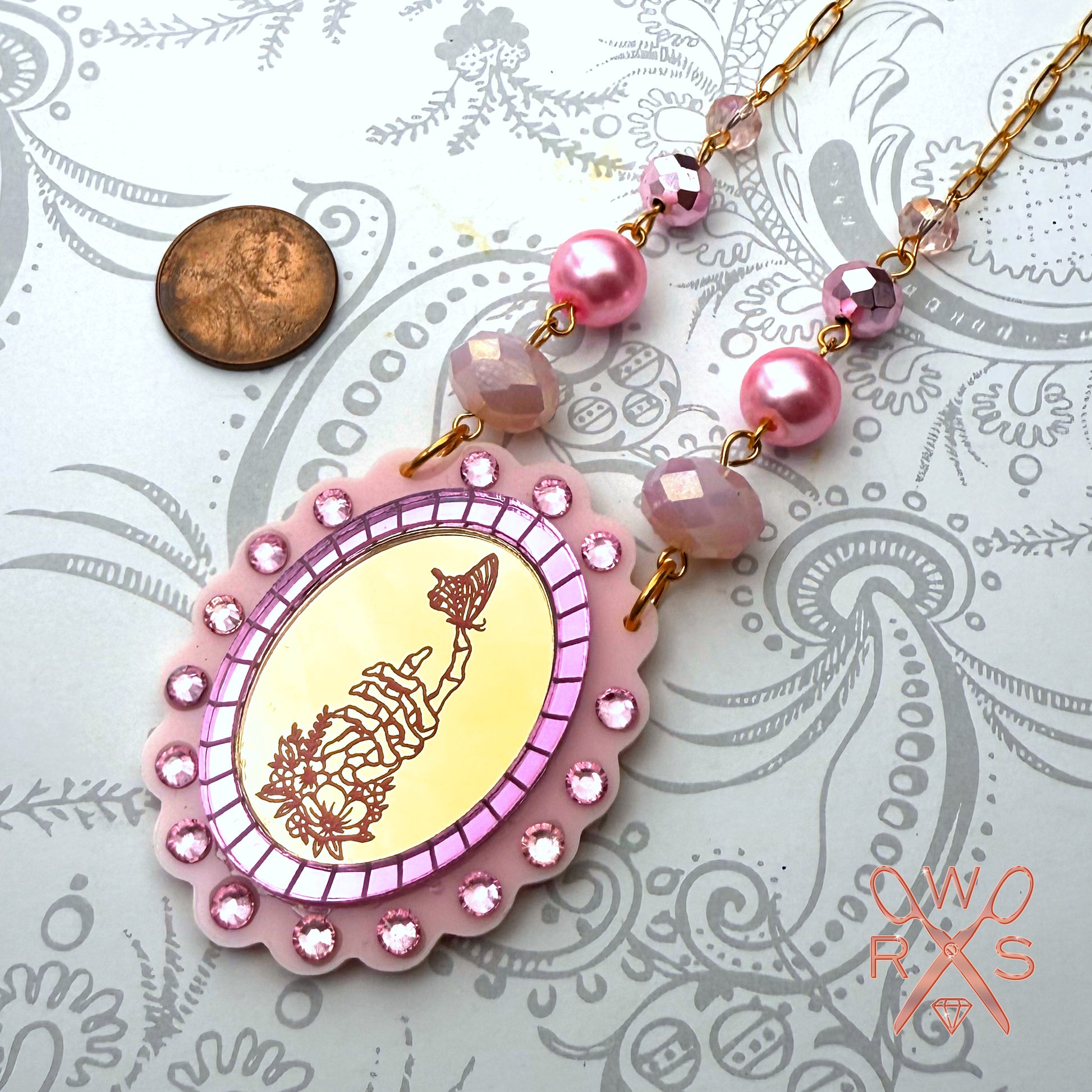 Unleash your inner goth and girly side with our Life After Death Cameo Necklace in Pink from the GothicBloom Collection. This beautiful necklace features a pink cameo, gold mirror with etched skeleton hand and butterfly, and pink rhinestones for a classic twist. On a gold chain with beaded accents this necklace can take you from day to night, add a fun and surprising sparkle to any outfit with this undead-inspired necklace.