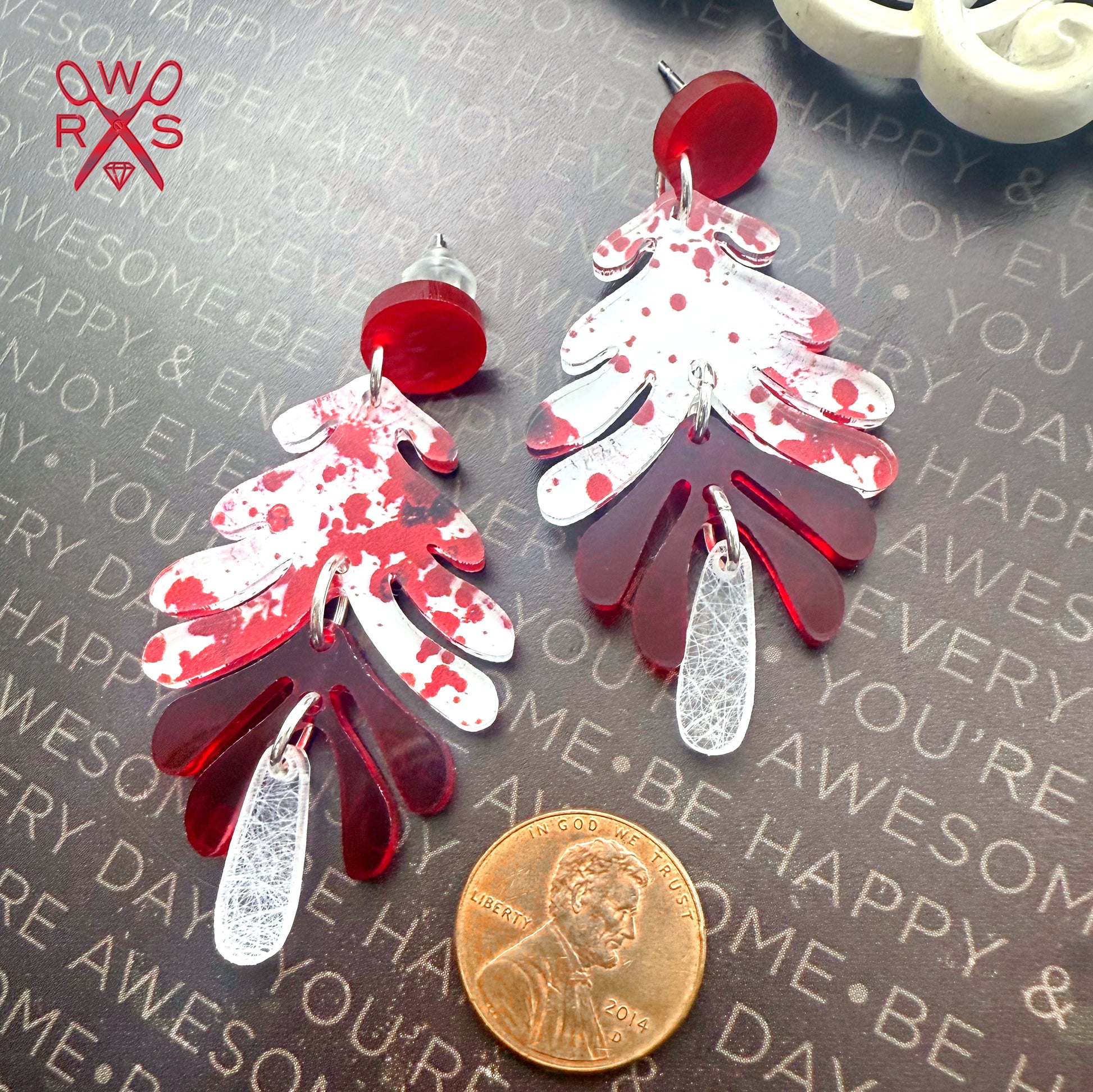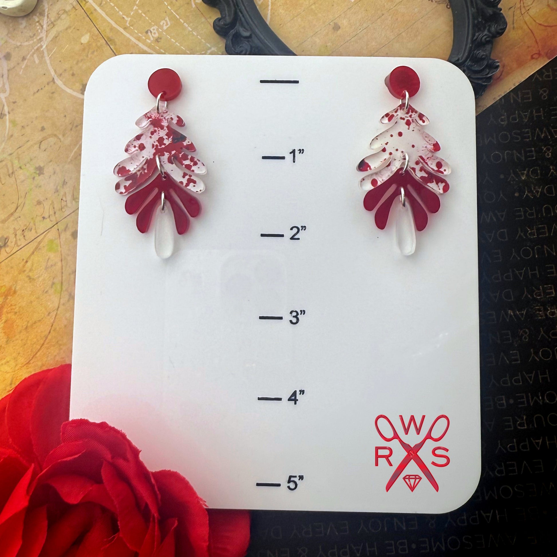 Bring a playful yet spooky edge to your outfit with the Aspen Dangles in Blood Splatter from the Spells and Sparkles Collection. Featuring crimson red posts, blood splatter accents, and etched translucent drops, these earrings capture the eerie vibe of a crime scene with a fun twist. Perfect for true crime lovers and amateur detectives, their stainless steel posts ensure comfort while making a striking statement. Pretty, creepy, and versatile—these dangles are ready to pair with anything in your wardrobe.