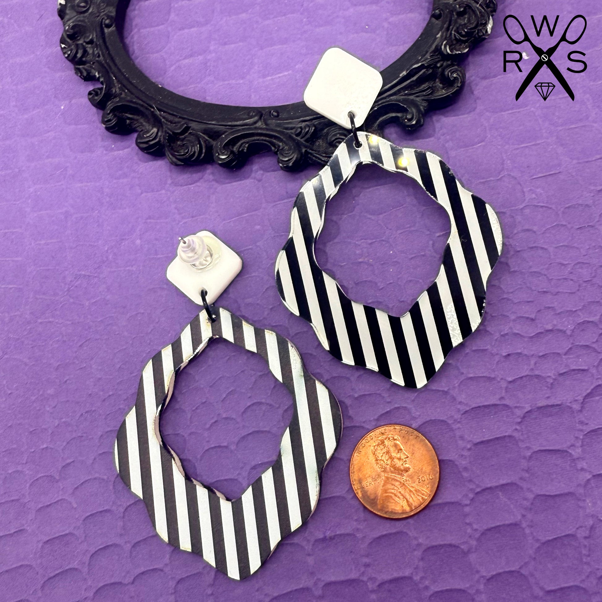 The Big Flirt Dangles in Black and White Stripe bring playful fun to any outfit. Featuring glossy, laser-cut acrylic with bold horizontal stripes, these eye-catching earrings trick the eye with their unique design. Stainless steel posts ensure durability and comfort, making them perfect for Halloween or any occasion that calls for a cute, attention-grabbing accessory. Add a touch of sparkle and whimsy with these charming, striped dangles.