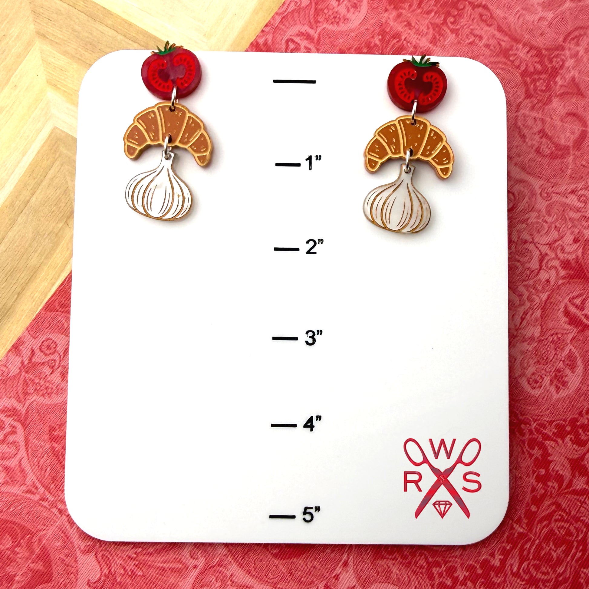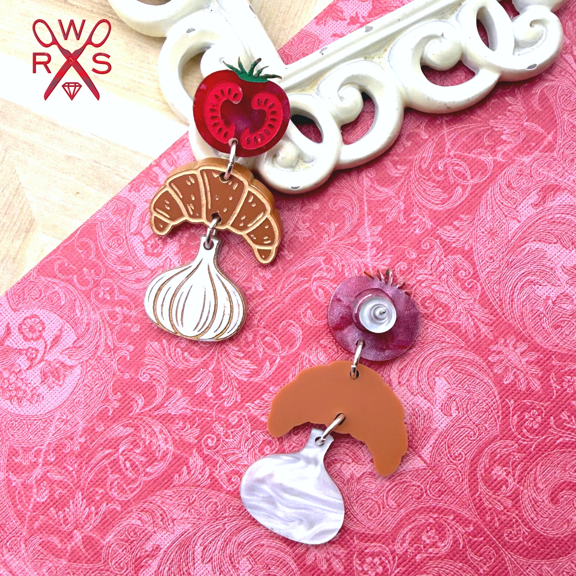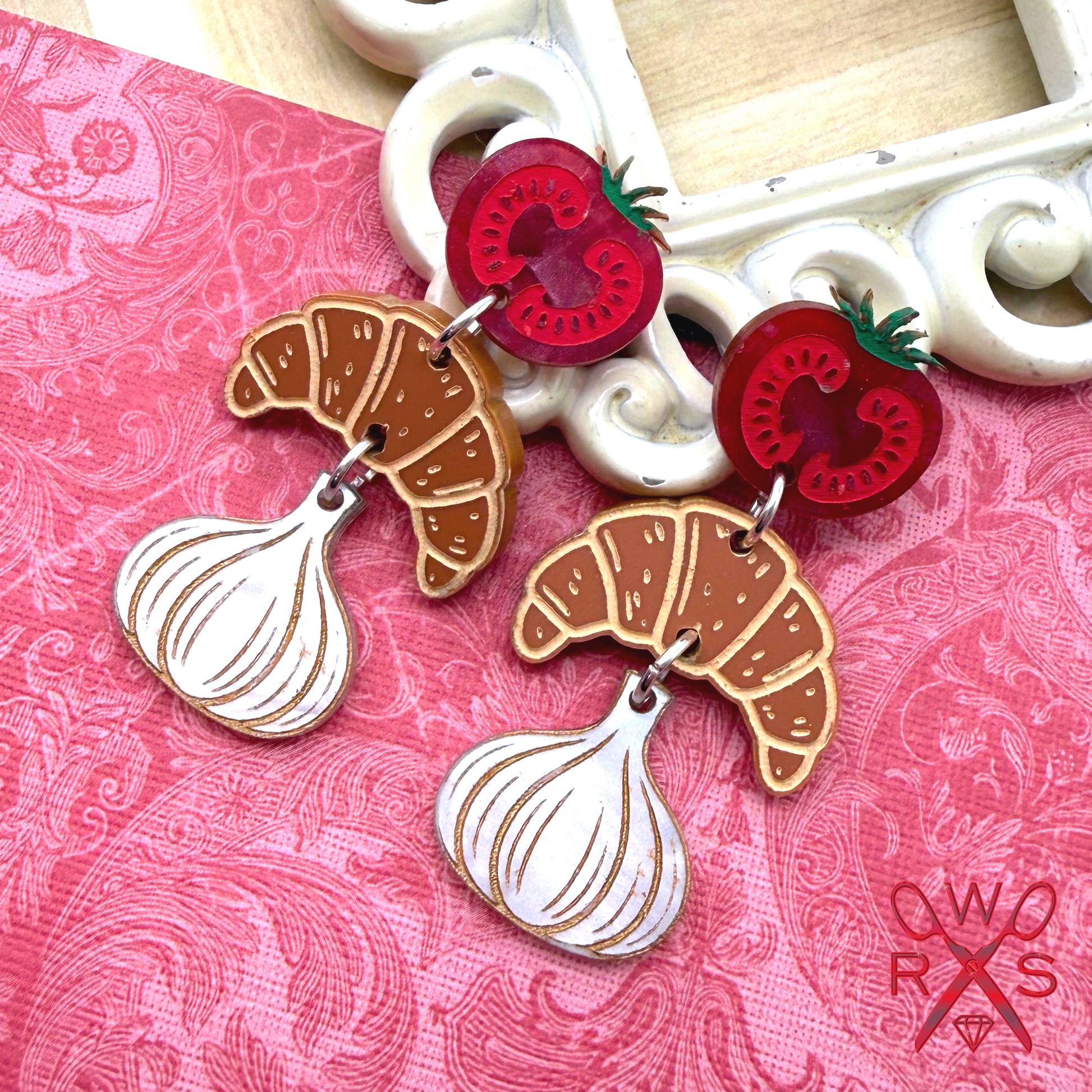 Dinner Date Dangles bring culinary charm to your jewelry collection. These playful dangle earrings feature a vibrant red tomato, a flaky brown croissant, and a fragrant garlic bulb—perfect for food lovers and home chefs who heat up the kitchen with passion. Each pair captures the joy of cooking with special ingredients and the fun of creating something delicious. Whether you're a seasoned chef or simply adore the aroma of a meal in progress, these unique, cute earrings celebrate your love of food and flavor. From the Spring2026 Collection, Dinner Date Dangles are a delightful conversation starter for anyone who believes the best dates happen around the dinner table.