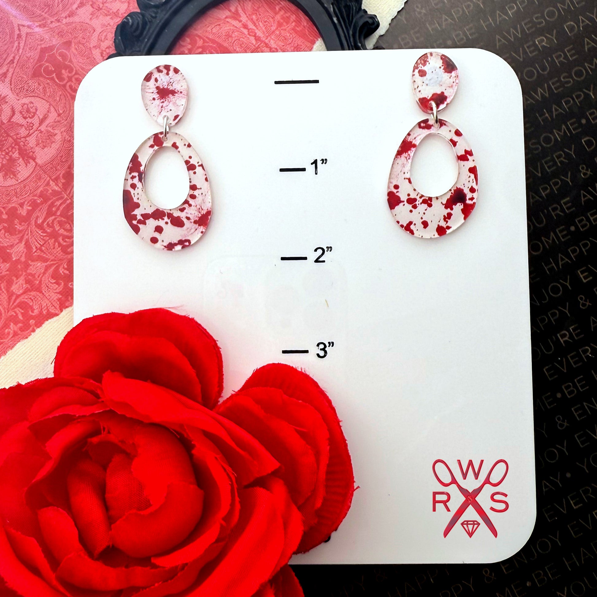 Bring a playful yet spooky edge to your outfit with the Everyday Dangles in Blood Splatter from the Spells and Sparkles Collection. Featuring crimson red blood splatter accents, these earrings capture the eerie vibe of a crime scene with a fun twist. Perfect for true crime lovers and amateur detectives, their stainless steel posts ensure comfort while making a striking statement. Pretty, creepy, and versatile—these dangles are ready to pair with anything in your wardrobe.