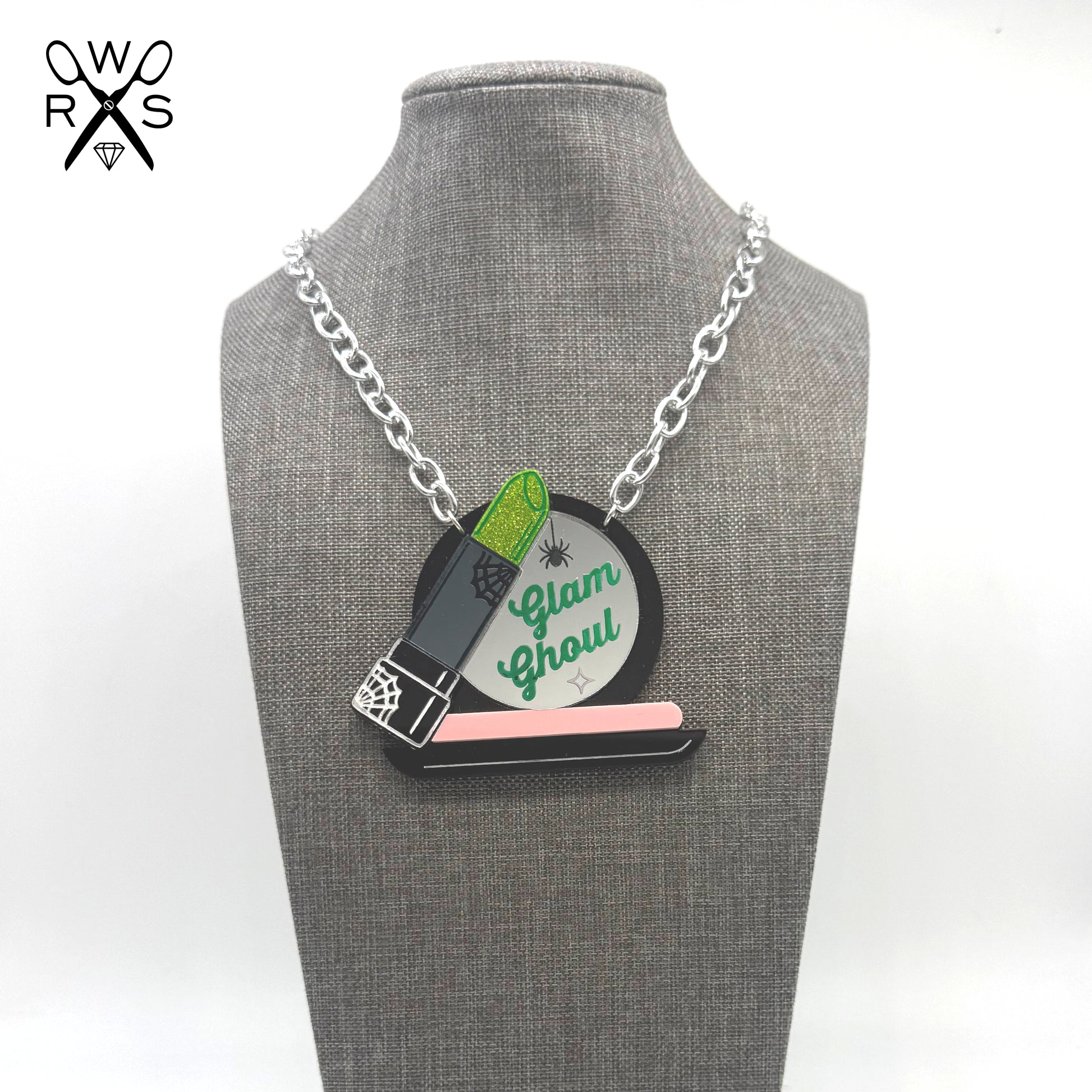 Celebrate your spooky side with the Glam Ghoul Lipstick and Compact Necklace from the Spells and Sparkles Collection. This playful pendant necklace features a black makeup compact adorned with a full moon mirror, a pink makeup puff,  a creepy spider, and a vibrant green lipstick in a quirky tube. Perfect for makeup lovers and Halloween fans alike, it adds a shiny touch of glamour to any outfit. Show off your love for spooky style, makeup and sparkle with this fun accessory that’s sure to enchant ghouls, spirits, and makeup artists everywhere. Get ready to shine and let your glamorous, creepy side glow!