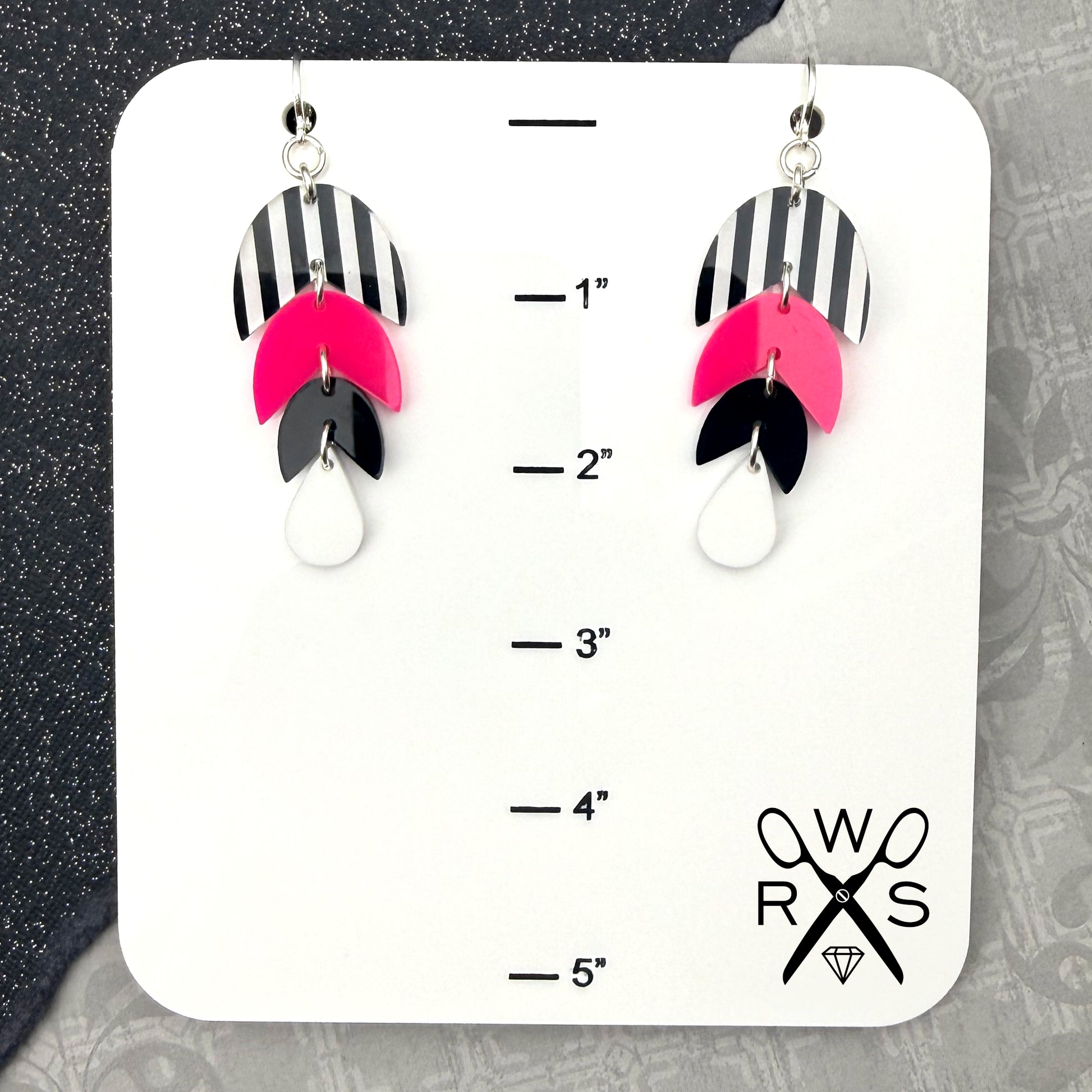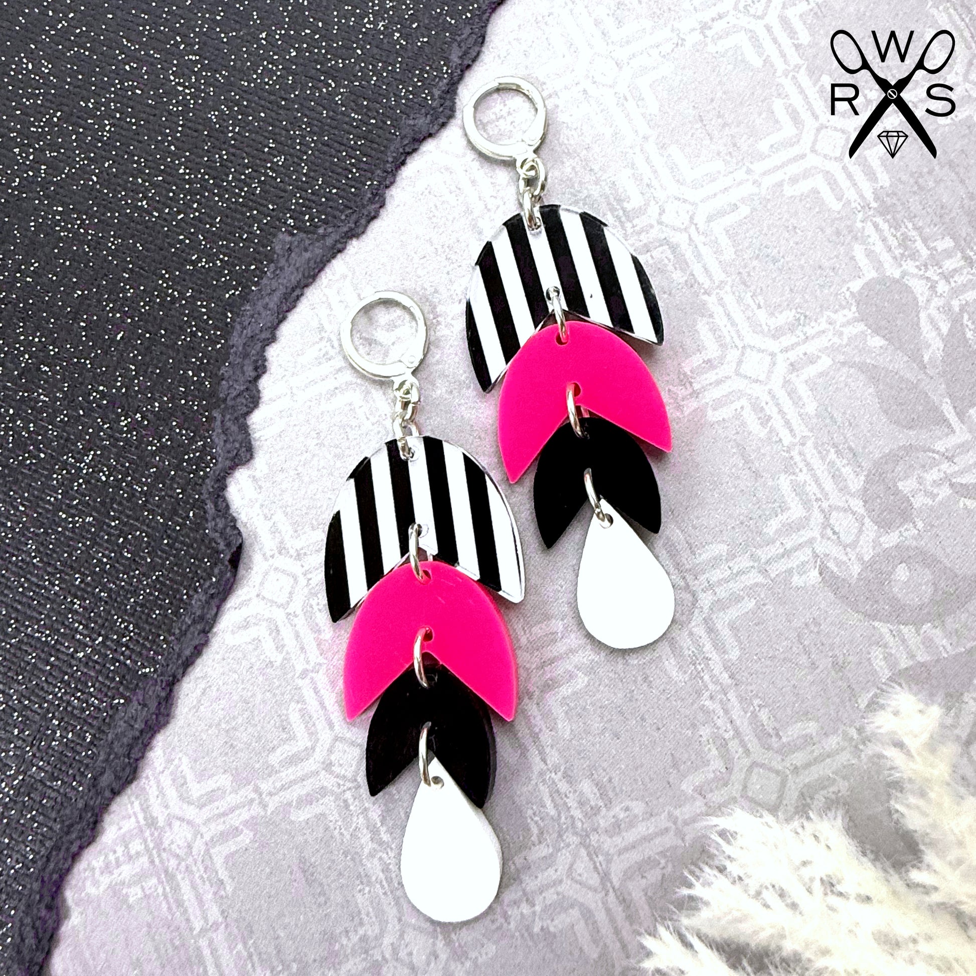 Flirt with flair in these Havana Huggies In Stripes and Neon Pink from our Spring2026 Collection. Tiered dangle earrings feature a playful black and white striped huggie paired with neon pink, black, and bright white teardrop charms that cascade below. Perfect for date nights, graduation, or whenever you want to channel your inner spunk and glow. Cute, casual, and unapologetically fun—because girls just want to have fun.