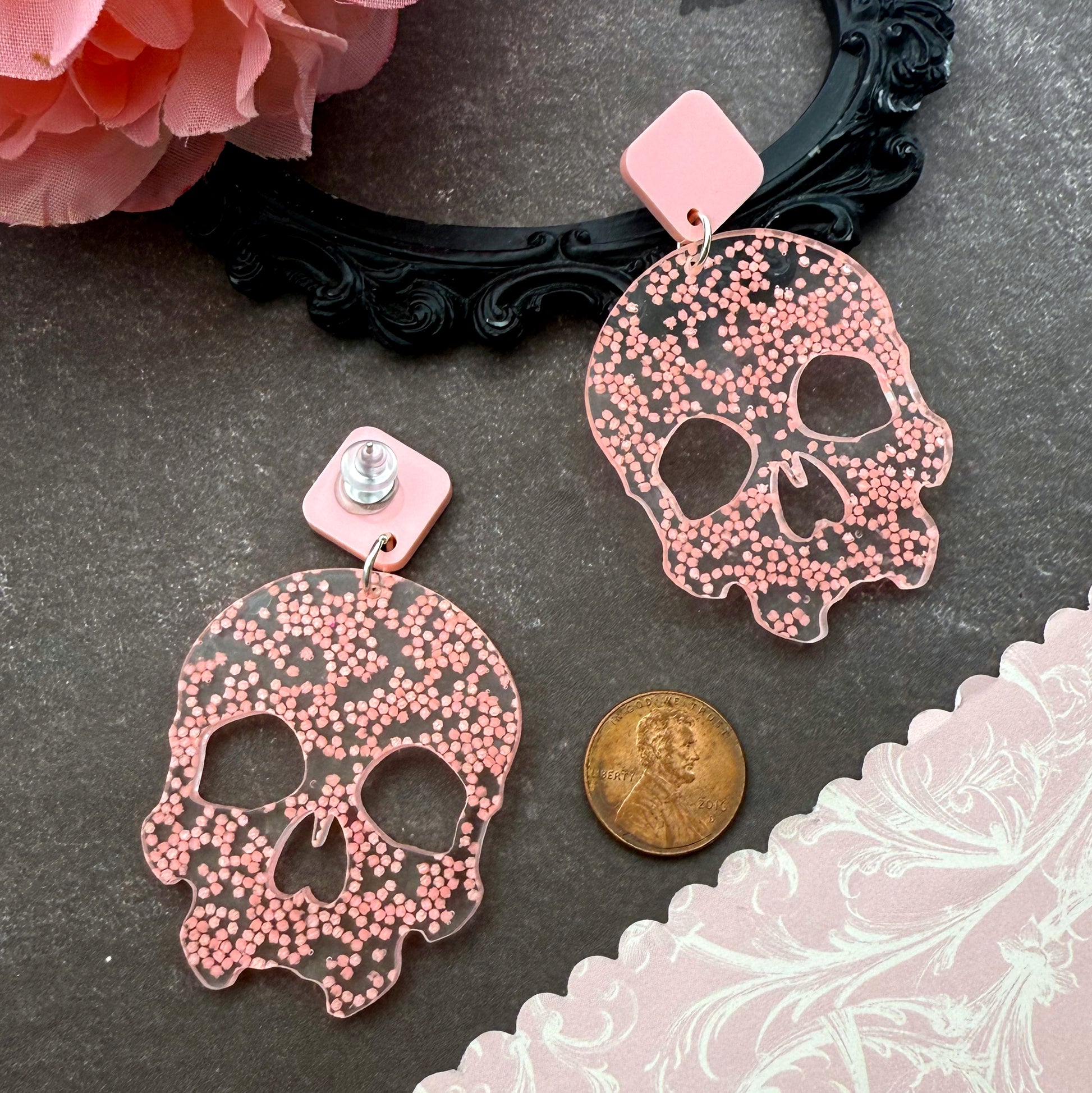 Pink Glow Skull Dangles from the Spells and Sparkles Collection bring edgy charm with a sweet twist. These laser-cut skull earrings glow in the dark, perfect for lighting up your night with spooky-cute vibes. Featuring diamond-shaped pink posts with secure push-back closures, they're ideal for anyone who loves mixing goth aesthetics with playful sparkle. Whether you're channeling barbiecore energy or embracing your punk-glam side, these electric dangles deliver midnight mischief with pretty-in-pink flair. Dead or alive, they'll have you glowing.